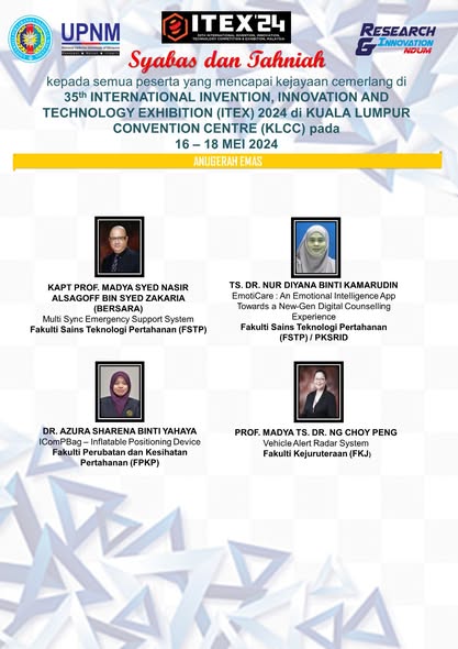 Universiti Pertahanan Nasional Malaysia (UPNM) melalui Bahagian Penyelidikan dan Inovasi (BPI) telah mengambil bahagian dalam 35th International Invention, Innovation and Technology Exhibition (ITEX) 2024 di Kuala Lumpur Convention Centre (KLCC) pada 16 – 18 Mei 2024. Pameran ITEX 2024 diadakan bertujuan untuk mempamerkan hasil penyelidikan dan pembangunan (R&D), teknologi terkini serta memberi pendedahan dan peluang pemasaran terhadap reka bentuk produk dan perkhidmatan.